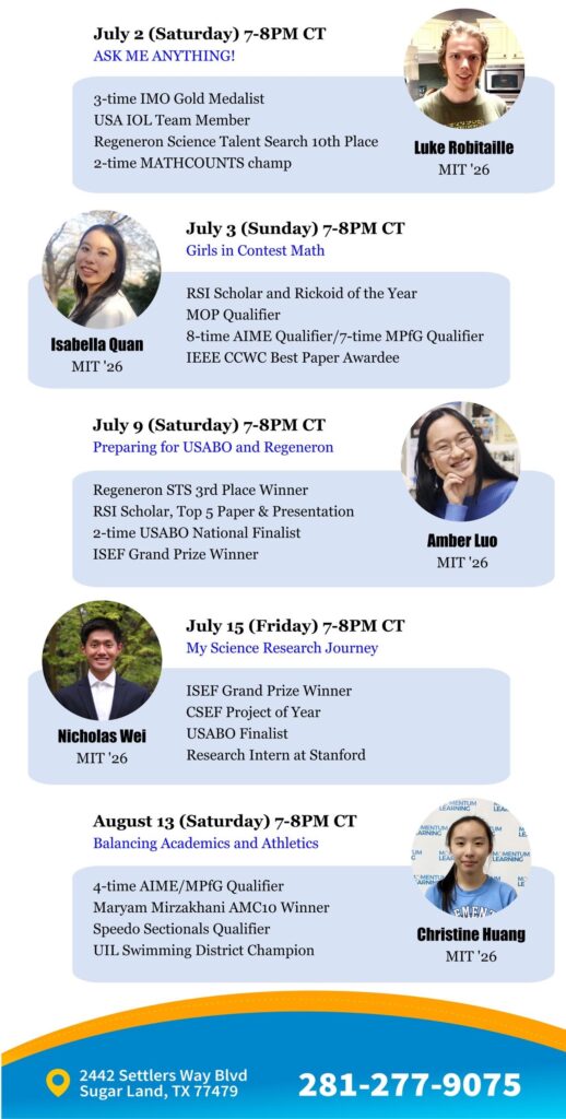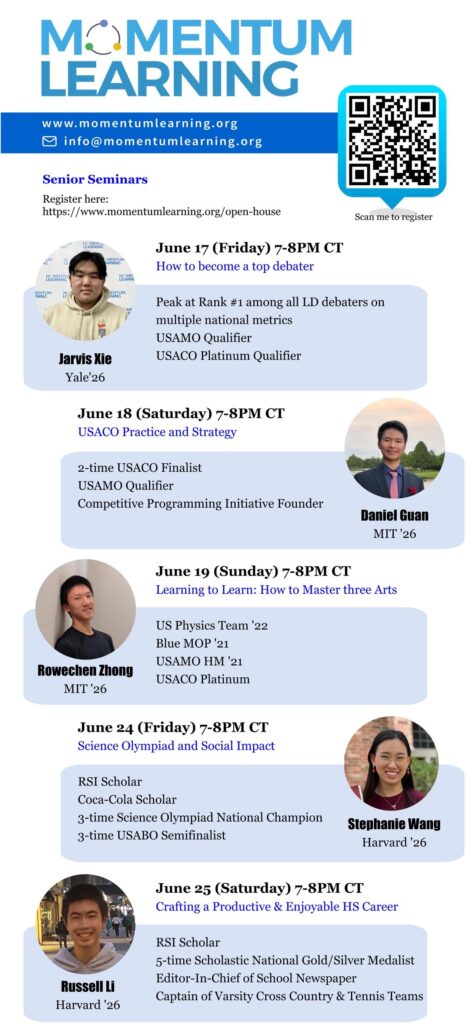 | 5 | June 25 | Russell Li | Crafting a Productive & Enjoyable HS Career | Click to view | Click to view |